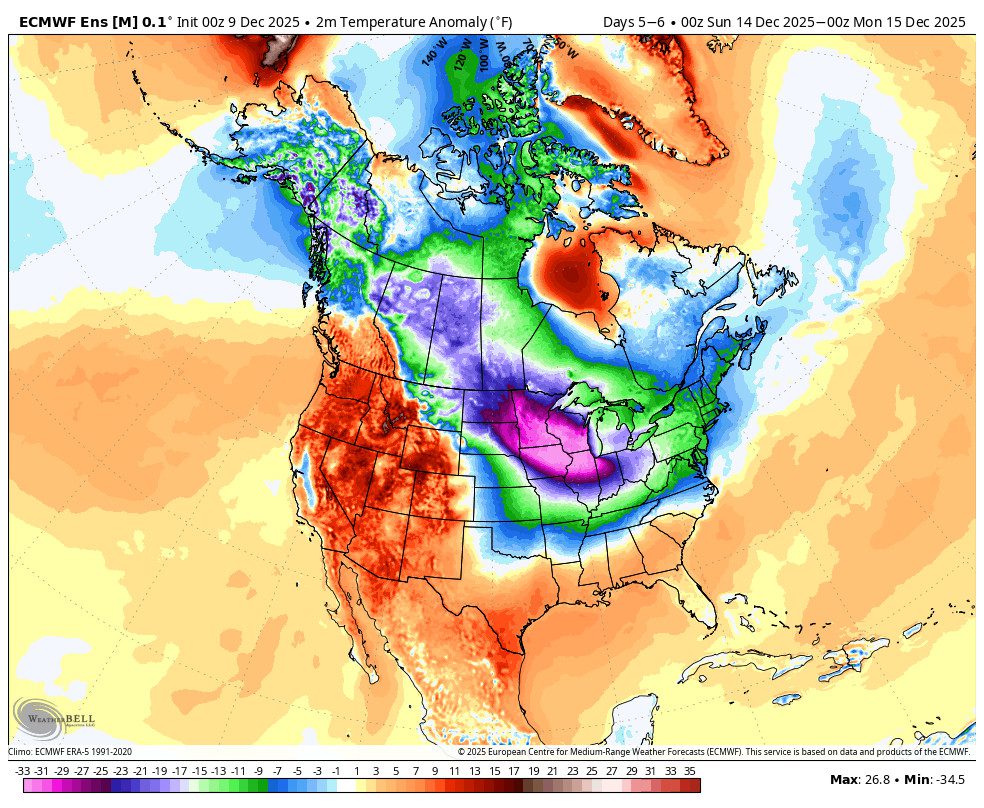 With the continued disruption of the polar vortex and very cold Arctic air pooling over Canada, which will continue to try and slide down east of the Rockies into the eastern U.S. through mid-December, the long-range models may continue the trend of amplifying the western ridge as we get closer to periods beyond a week.