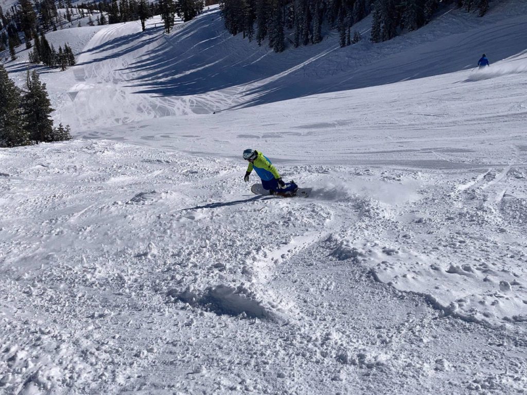 We arrived early in the morning and went straight to the Summit chair. It’s usually the best strategy on weekends when the crowds of skiers descend to Lake Tahoe. The lift was still closed, and people were lined up for it to open. So we decided to check on the Kangaroo chair first. There was no line there, just a few ski teams preparing to load. Both West Runout and Kangaroo Main runs were closed for the race except for the narrow trail along the racecourse, but the off-piste area was open, so we skied to the left of Main run. The snow was soft with very gentle bumps, and it was a lovely start of the day!