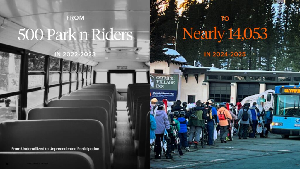 As we close out the second year of weekend/holiday reserved parking at Palisades Tahoe, we want to extend a sincere thank you to our guests and employees who continue to drive the success of this program. We fully understand that the program requires planning and action on the part of those who participate and that it is a shift from previous years, but, through your actions, the program has resulted in real and significant improvements to our operations, increased carpooling and alternative transit adoption, measurable positive environmental impacts, and benefits to our community that extend beyond our skiing and riding guests.