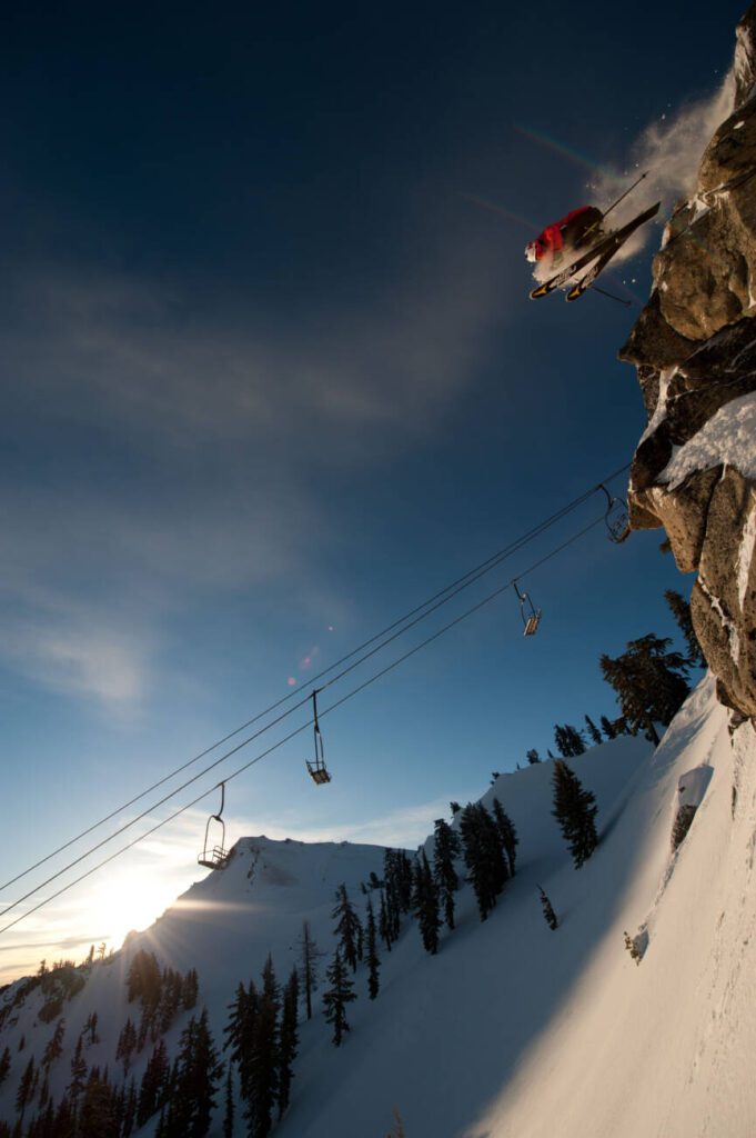 In the winter of 2011, after completing a shoot on Eagle’s Nest at what was then Sq**w Valley, I ran into Mike Wilson. After a quick chat, I watched as he skied away, eventually stopping midway down the Fingers where he was building a kicker. Standing 100 yards or so away, I waited for the upcoming show. As Wilson charged down the line I decided to pull out my camera and snapped a sequence of his enormous double back flip.
