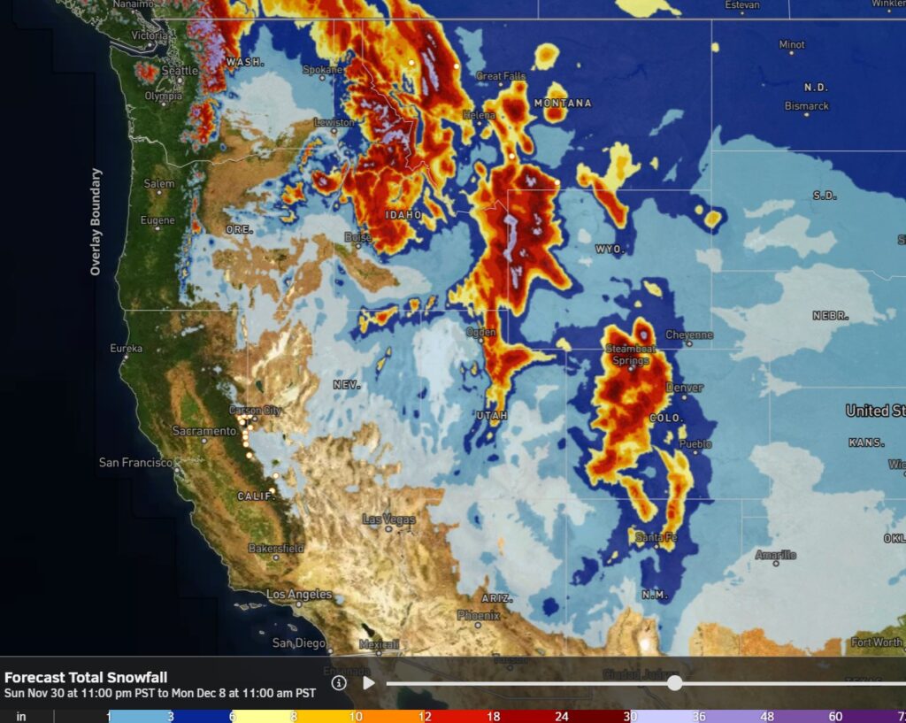 Rain could move in by late afternoon/evening from the next system with snow levels possibly staying above 8000 ft. into Sunday morning. We could see rain showers Sunday but we could also have a bit of a break. 1-3″ of wet snow is possible above 8000 ft. based on the latest model runs. Ridgetop winds increasing to 80+ mph. Highs in the 30s on the mountain