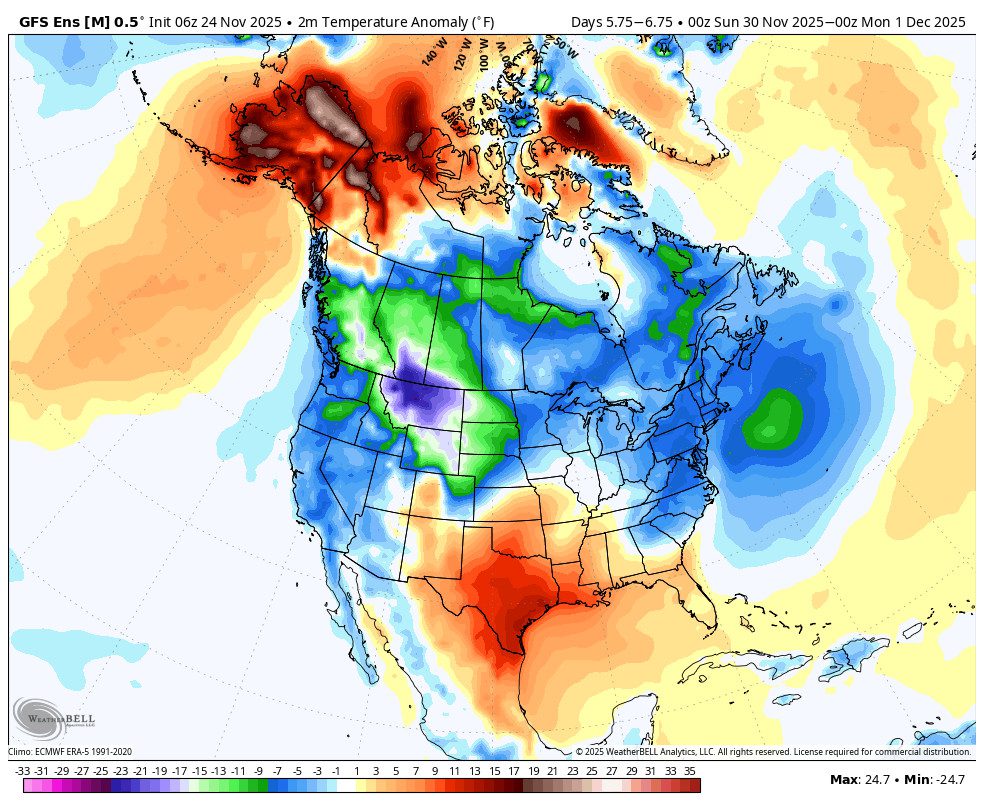First off, we have a pretty good agreement this morning among the ensemble mean models in a similar shift in the pattern. Also, the teleconnection pattern forecasts for the Pacific North American (PNA) pattern seem to be lining up in a -PNA (West Coast trough) pattern emerging around the 1st weekend in December.