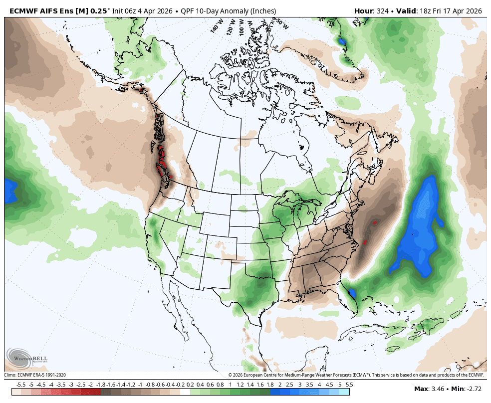The pattern shifts by Wednesday with the strongest high pressure forecast to be mostly in the north Pacific and eastern U.S., and troughing over the West Coast. This pattern could last for at least 10 days through mid-April.