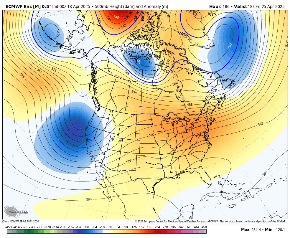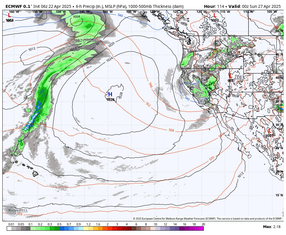 The storm door is forecast to remain open through the last week of March, but we are into the spring pattern and stronger storms will be harder to come by. The trough will slowly shift east with time so any storms may drop down from the north over land which is a drier track. So we could see a few weak systems during the last week of the month.