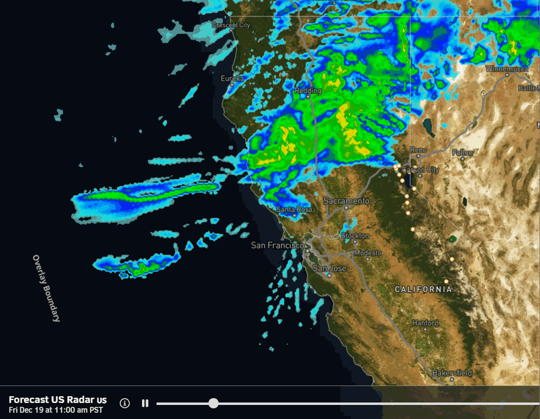 The latest model runs continue to show two main low-pressure systems spinning up off the coast and moving quickly into CA, with precipitation arriving Tuesday night and continuing through Christmas Day, and snow showers lingering into the 26th. There may even be a smaller wave between the storms, keeping the snow going continuously from Tuesday night through Thursday night.